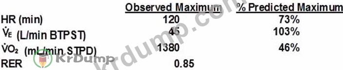 증상 제한 운동(스트레스) 테스트에서 얻은 결과는 다음과 같습니다.