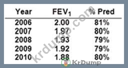 유육종증이 있는 45세 여성이 매년 폐 기능 검사를 받습니다. 다음 데이터가 기록되었습니다.