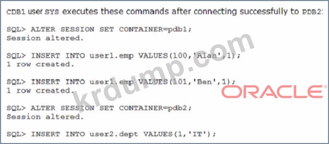 다음 구성을 검사하십시오. 1. CDB1은 컨테이너 데이터베이스입니다. 2. COMMON_USER_PREFIX는 C##입니다. 3. PDB1은 CDB1에 포함된 플러그형 데이터베이스입니다. 4. APP1_ROOT은 CDB1에 포함된 애플리케이션 컨테이너입니다. 5. APP1_PDB1은 APP1_ROOT에 포함된 애플리케이션 PDB이다. 다음 명령을 성공적으로 실행합니다. 다음 중 어느 것이 사실입니까? (2개를 선택하세요.)