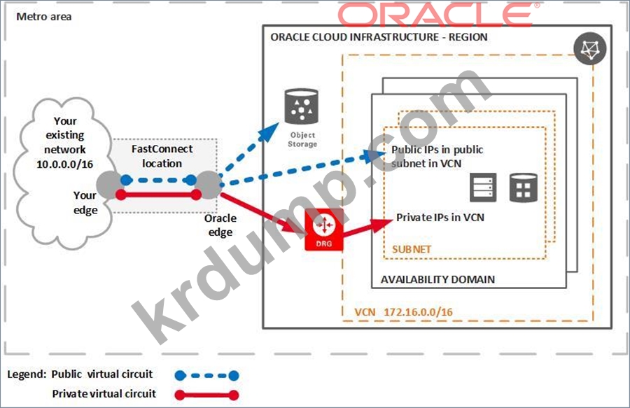 데이터 센터와 Oracle Cloud Infrastructure(OCI) 간의 고대역폭 중복 연결을 설계하고 있습니다. OCI FastConnect 위치를 조사하는 동안 Ashburn 지역의 Oracle FastConnect 위치 중 한 곳에서 Oracle과 같은 위치에 있다는 것을 알게 되었습니다.