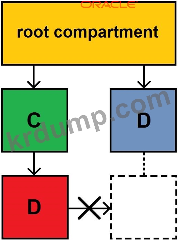 You have compartments C and D under the root compartment in your Oracle Cloud Infrastructure (OCI) tenancy; compartment C contains asub-compartment also named D.