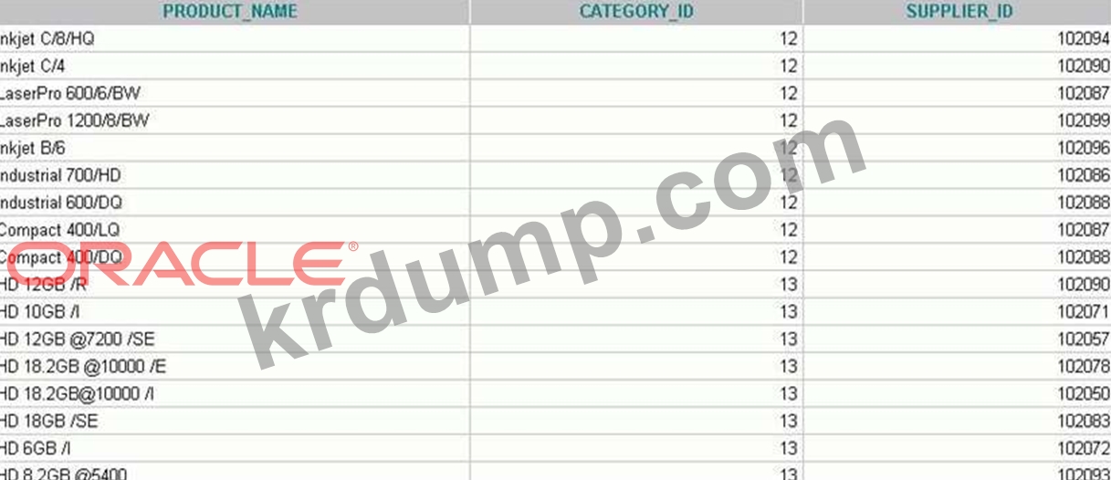 CATEGORYJD 열의 값이 12 또는 13이고 SUPPLIER_ID 열의 값이 102088인 테이블에서 PRODUCT_NAME 및 LIST_PRICE를 표시해야 하는 요구 사항이 있습니다. 다음 SQL 문을 실행했습니다.