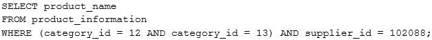 CATEGORY_ID 열의 값이 12 또는 13이고 SUPPLIER_ID 열의 값이 102088인 테이블에서 PRODUCT_NAME을 표시해야 합니다.