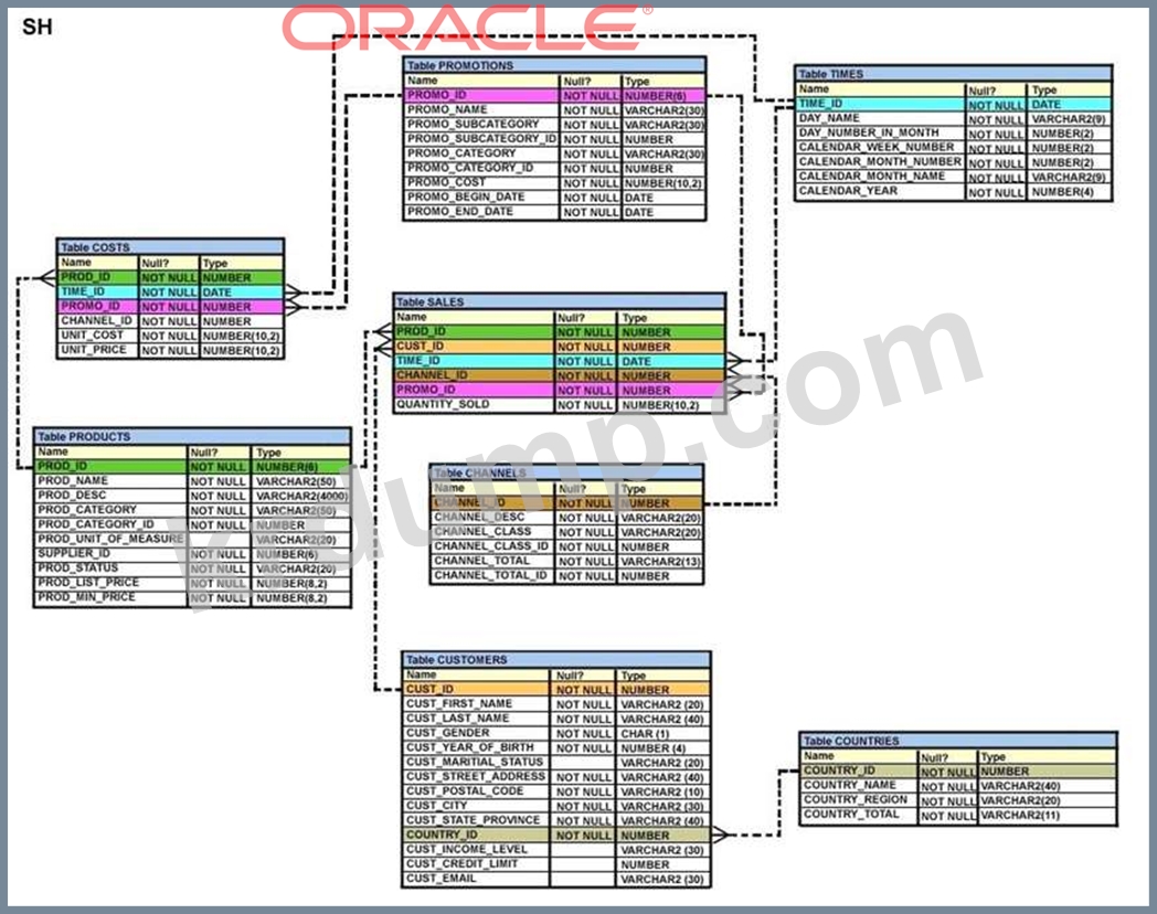 CUST_ID 및 TIME_ID 열은 각각 CUSTOMERS 및 TIMES 테이블을 참조하는 SALES 테이블의 외래 키이기도 합니다.
