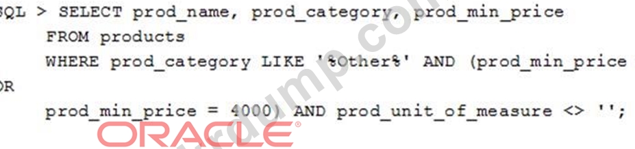 최소 가격이 $2000 또는 $4000이고 측정 단위가 없는 '소프트웨어/기타' 범주에 속하는 PRODUCTS 테이블의 제품 이름을 표시해야 합니다.