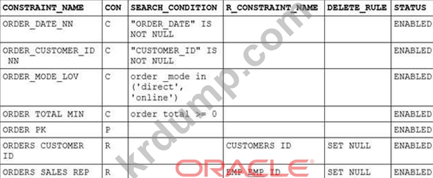 SELECT 제약 조건 이름, 제약 조건 유형, 검색 조건, r_constraints_이름, 삭제 규칙, 상태, FROM user_constraints WHERE table_name = 'ORDERS'; 출력에 대한 설명으로 옳은 것은? (2개를 선택하세요.)