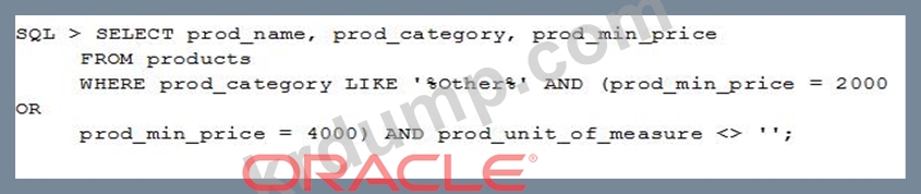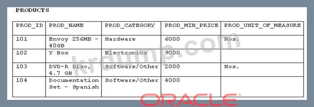 최소 가격이 $2000 또는 $4000이고 측정 단위가 없는 '소프트웨어/기타' 범주에 속하는 PRODUCTS 테이블의 제품 이름을 표시해야 합니다.