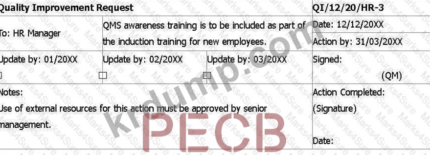 1단계 인증 심사 3개월 후, 다른 심사원 한 명과 함께 XYZ Corporation에 감사팀장 자격으로 2단계 인증 심사를 실시합니다. 품질 관리자가 모든 직원의 기존 품질 목표를 취소하고 본인을 위한 단일 목표로 대체한 것을 알게 됩니다. 이 목표에는 "품질 관리자는 내년에 QMS를 여러 측면에서 개선할 것입니다"라는 내용이 명시되어 있습니다. 품질 관리자는 이 목표가 품질 개선이 필요할 때 부서 관리자에게 지시를 내릴 권한을 부여한다고 말합니다. 그는 이러한 접근 방식이 고위 경영진의 전폭적인 지지를 받고 있다고 말합니다. 그는 지난 경영진 검토에 포함된 최신 품질 개선 요청서를 보여줍니다.
