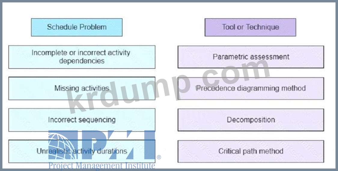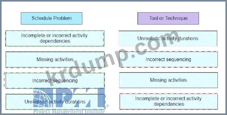 프로젝트를 시작한 지 몇 달 만에 여러 가지 일정 문제가 발생했습니다. 왼쪽의 일정 문제를 오른쪽의 특정 도구로 끌어다 놓으세요. 일정 개발 중에 이 도구를 구현했다면 문제를 예방할 수 있었을 것입니다.