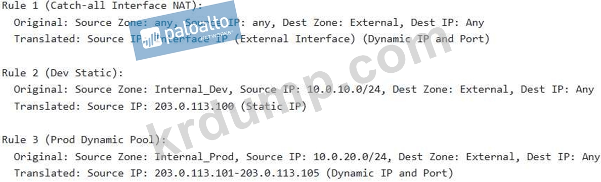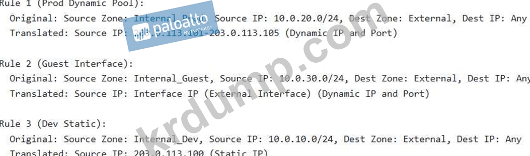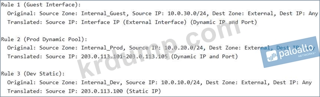 2. 'Internal _ Prod'(10.0.20.0/24)는 높은 동시성을 위해 공개 IP 풀(203.0.113.101-203.0.113.105)에 대한 소스 NAT를 수행해야 합니다.