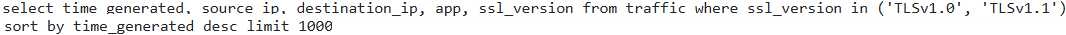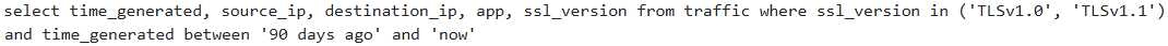 보안 감사자가 지난 90일 동안 더 이상 사용되지 않는 SSL/TLS 버전(예: TLSv1.0 또는 TLSv1.1)을 활용한 모든 네트워크 연결에 대한 세부 정보가 포함된 보고서를 요청합니다. 이 조직은 로그 집계를 위해 Strata Logging Service를 사용합니다. 관련 필드가 캡처되었다고 가정하고, 이 정보를 검색하는 데 가장 효과적인 Strata Logging Service Query Language(SLQL) 쿼리를 제공하십시오.