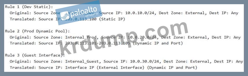 1. 'Internal _ Dev'(10.0.10.0/24)는 전용 공용 IP 203.0.113.100으로 소스 NAT를 해야 합니다.