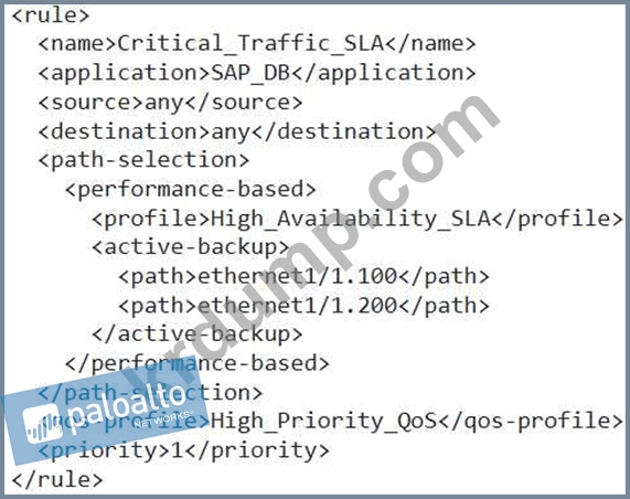 보안 분석가가 Panorama를 통해 구현된 SD-WAN 프로필을 검토하고 있습니다. 분석가는 다음과 같은 구조의 SD-WAN 정책 규칙을 발견했습니다.