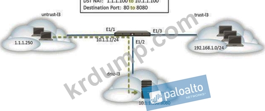 웹 서버는 포트 8080에서 HTTP 트래픽을 수신하도록 구성됩니다. 클라이언트는 TCP 포트 80에서 IP 주소 1.1.1.100을 사용하여 웹 서버에 액세스합니다. 대상 NAT 규칙은 IP 주소와 보고서를 모두 10.1.1.100으로 변환하도록 구성됩니다. TCP 포트 8080.