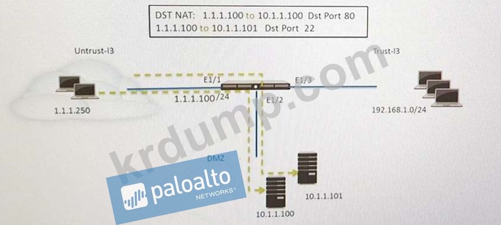 관리자는 DNAT를 사용하여 두 대의 서버를 단일 공용 IP 주소에 매핑합니다. 트래픽은 애플리케이션을 기반으로 특정 서버로 조정됩니다. 여기서 호스트 A(10.1.1.100)는 HTTP 트래픽을 수신하고 호스트 B(10.1.1.101)는 SSH 트래픽을 수신합니다.) 이 구성을 수행하는 두 가지 보안 정책 규칙은? (2개를 선택하세요.)
