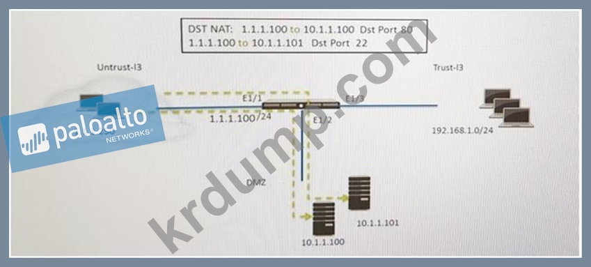 관리자는 DNAT를 사용하여 두 대의 서버를 단일 공용 IP 주소에 매핑합니다. 트래픽은 애플리케이션을 기반으로 특정 서버로 조정됩니다. 여기서 호스트 A(10.1.1.100)는 HTTP 트래픽을 수신하고 호스트 B(10.1.1.101)는 SSH 트래픽을 수신합니다.) 이 구성을 수행하는 두 가지 보안 정책 규칙은? (2개를 선택하세요.)