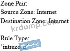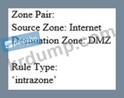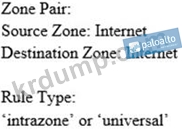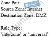 인터넷 영역의 사용자가 DMZ 영역에서 호스팅되는 웹 서버에 성공적으로 연결할 수 있도록 하는 영역 쌍 및 규칙 유형은 무엇입니까? 웹 서버는 Palo Alto Networks 방화벽의 대상 Nat 정책을 사용하여 연결할 수 있습니다.