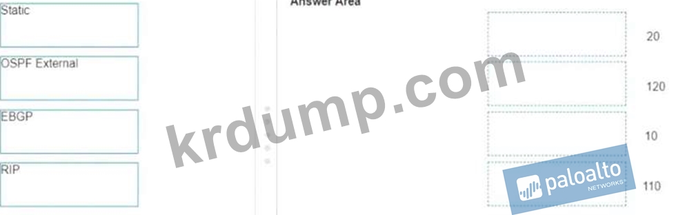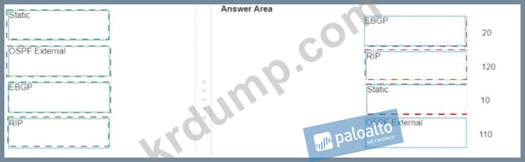 엔지니어가 가상 라우터를 통한 트래픽 라우팅 문제를 해결하고 있습니다. 방화벽은 여러 라우팅 프로토콜을 사용하고 엔지니어는 라우팅 우선 순위를 결정하려고 합니다. 각 라우팅 프로토콜에 대한 기본 관리 거리를 일치시킵니다.