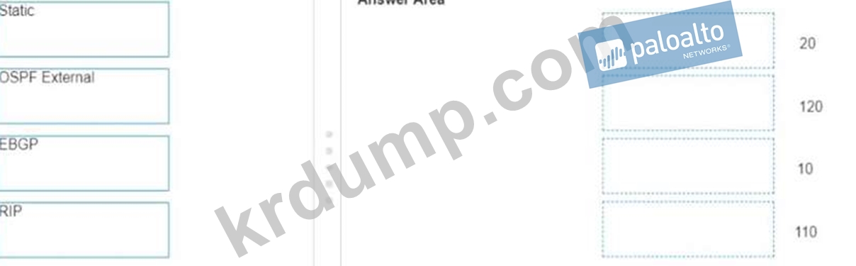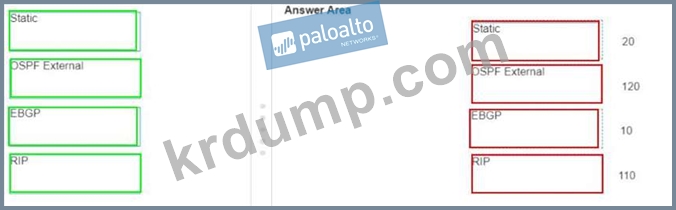 엔지니어가 가상 라우터를 통한 트래픽 라우팅 문제를 해결하고 있습니다. 방화벽은 여러 라우팅 프로토콜을 사용하고 엔지니어는 라우팅 우선 순위를 결정하려고 합니다. 각 라우팅 프로토콜에 대한 기본 관리 거리를 일치시킵니다.