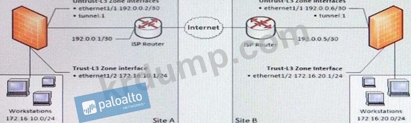 각 사이트는 VPN 연결을 위해 Untrust-L3 영역에서 tunnel.1을 사용하고 있습니다. 사이트 A의 트래픽이 사이트 B의 모든 워크스테이션에 도달하도록 하려면 사이트 A 방화벽의 기본 가상 라우터에 정적 경로를 추가해야 합니다.