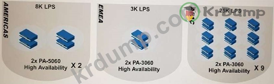 네트워크는 미주, 유럽(EMEA) 및 아시아(APAC)의 세 지역을 포괄합니다. 네트워크의 APAC 세그먼트는 PA-3060 방화벽의 9개 HA 쌍으로 구성되어 초당 25K 로그의 통합 로그 출력을 생성합니다. 트래픽 로그 보존 기간은 14일만 필요합니다.