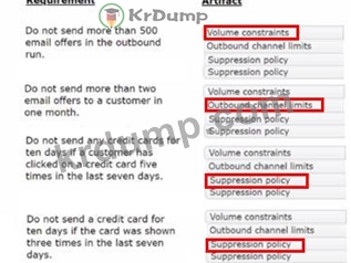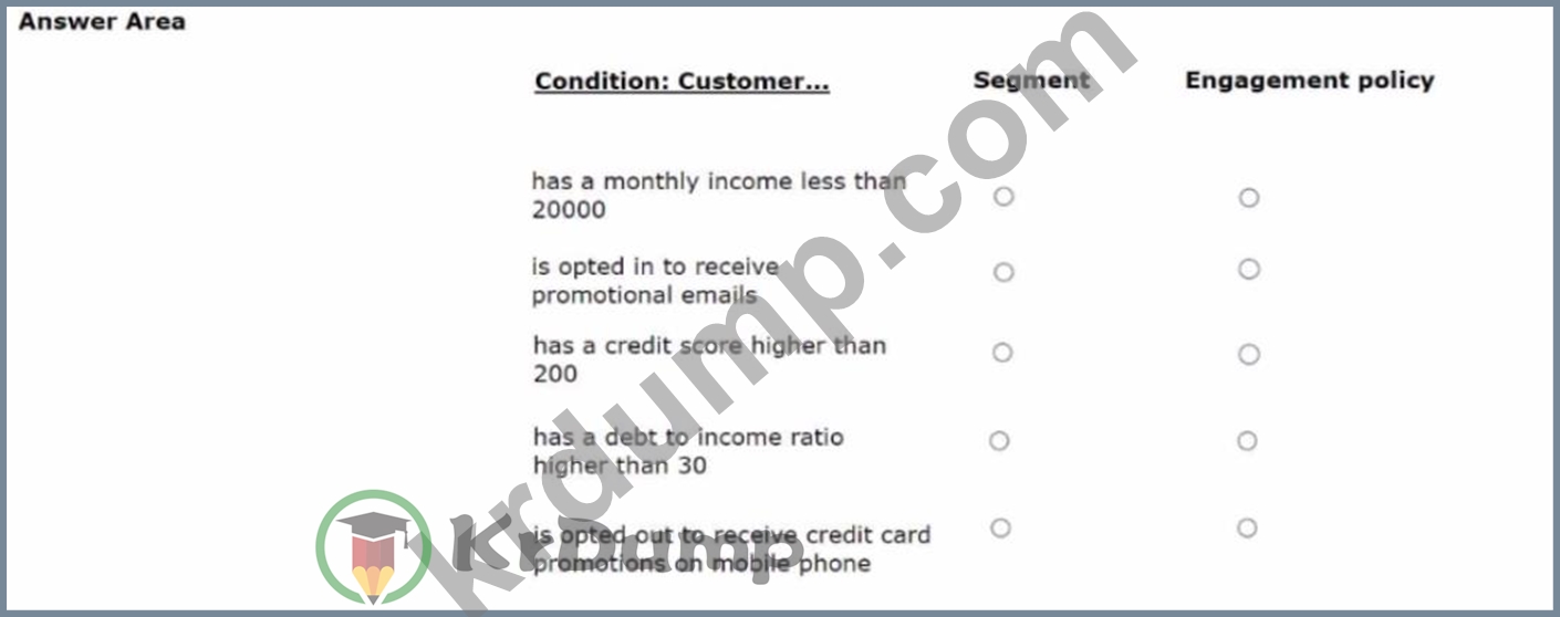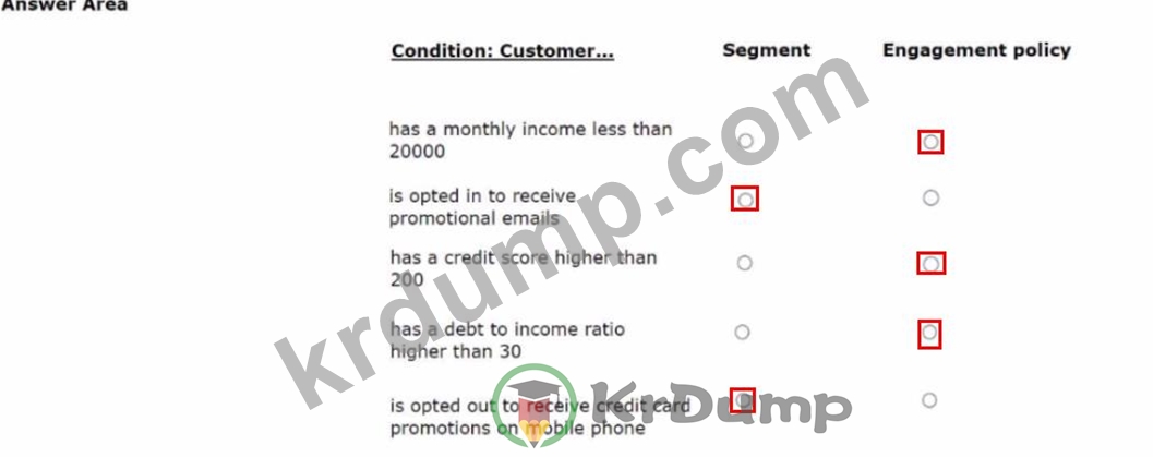 For each condition below, select which two conditions should be defined in Segment and which three conditions should be defined in Engagement policy as best practice.