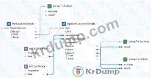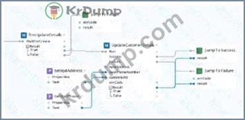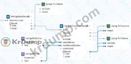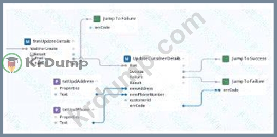 Within your project for a car renting company, you create an automation that reads data From an online form and calls a subautomation that saves that data in the company's application. The UpdateCustomerDetails subautomation has two exit points, Success and Failure, and two output parameters. Result and errCode.
