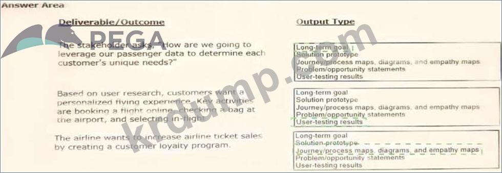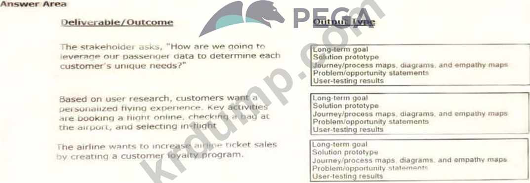 첫 번째 디자인 스프린트에서는 항공사와의 초기 워크숍에서 몇 가지 결과물과 결과를 얻습니다. 답변 영역에서 각 산출물 또는 결과에 대한 출력 유형을 식별합니다.