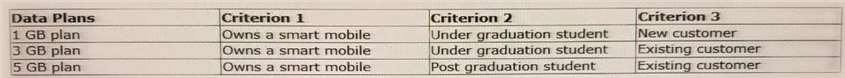 통신 회사인 Myco는 고객의 요구에 맞는 새로운 데이터 요금제 그룹을 제시했습니다. 아래 표에는 세 가지 데이터 계획 작업과 고객이 제안 자격을 갖추기 위해 충족해야 하는 기준이 나와 있습니다.