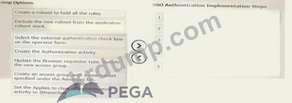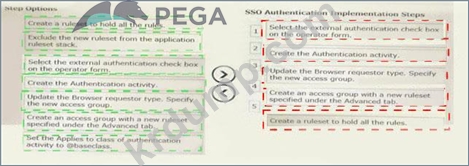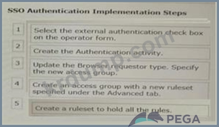 Pega 애플리케이션에서 싱글 사인온(SSO) 인증을 구현하는 데 필요한 5단계를 선택하여 SSO 인증 구현 단계 열로 이동합니다. (5개 선택)