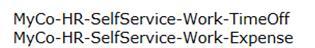 응용 프로그램에는 클래스 그룹 MyCo-HR-SelfService-Work가 포함되어 있습니다. Workclass에서 파생된 두 가지 클래스가 있습니다.