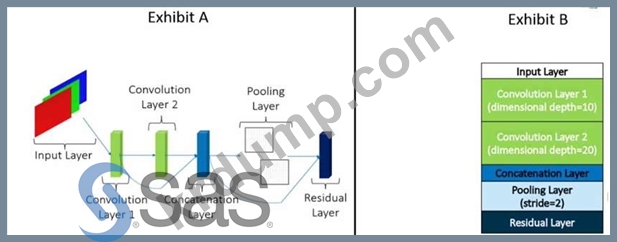 Exhibit A는 convolutional model의 구조를 자세히 설명합니다. Exhibit B는 모델의 각 레이어에 대한 세부 정보를 제공합니다. 파란색 화살표 선은 레이어 간의 연결을 나타냅니다. 위에 표시된 잔여 레이어의 깊이는 얼마입니까'?