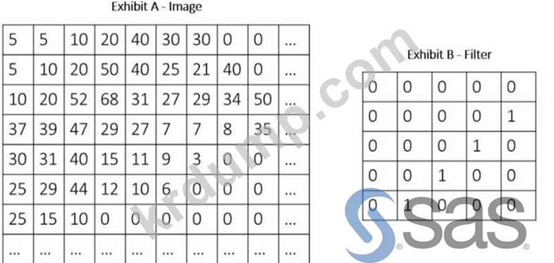224x224 그레이 스케일 이미지의 왼쪽 상단 모서리에 대한 픽셀 강도 값은 Exhibit A에 제공됩니다. 이 이미지는 모든 면에서 크기가 2인 동일한 제로 패딩을 사용하여 컨볼루션 필터(Exhibit B)에 대한 입력으로 제공됩니다. 이 필러(교차 상관 연산)를 적용한 결과의 기능 맵은 무엇입니까?