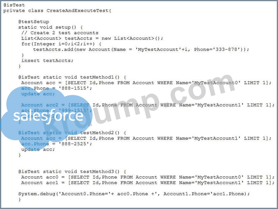 아래 코드에서 testSetup을 사용하여 테스트 데이터를 생성할 때 testMethod3에서 디버그 구문의 결과는 무엇입니까?
