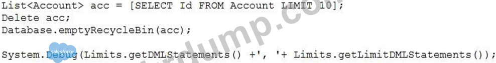 개발자는 Lead 개체에 대한 삽입 전 트리거를 사용하여 Territory__c.PostalCode__c가 Lead.PostalCode와 일치하는 Territory__c 개체를 가져옵니다. 개발자가 Apex 데이터 로더를 사용하여 10,000개의 리드 레코드를 삽입하면 코드가 실패합니다. 개발자는 다음 코드 블록을 가지고 있습니다. Line-01: for (Lead l: