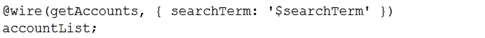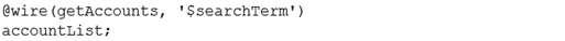 searchTerm이 지정된 계정 목록을 반환하는 Apex 메서드 getAccounts는 Lightning 웹 구성 요소에서 사용할 수 있습니다.