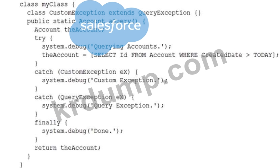 다음 예제에서 @query 메서드를 호출하는 동안 QueryExeption이 발생한 경우 디버그 로그의 출력은 무엇입니까?