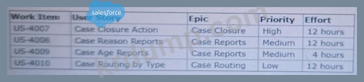 Universal Containers는 고객 서비스 부서를 혁신하도록 설계된 Salesforce 솔루션을 구현하고 있습니다. 스프린트 계획 중에 개발 팀이 나머지 모든 작업 항목을 성공적으로 전달할 수 있다고 결정되었습니다. 그러나 계획되지 않은 지연으로 인해 개발 팀은 현재 작업 항목을 완료할 수 없는 위험에 처해 있습니다.