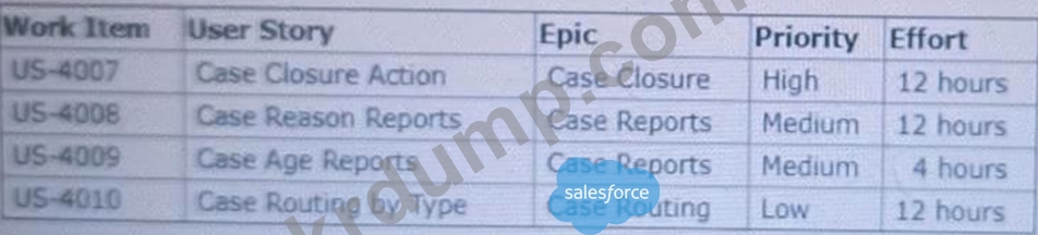 Universal Containers는 고객 서비스 부서를 혁신하기 위해 설계된 Salesforce 솔루션을 구현하고 있습니다. 스프린트 계획 단계에서는 개발팀이 남은 모든 작업 항목을 성공적으로 완료할 수 있을 것으로 예상했습니다. 그러나 예상치 못한 지연으로 인해 개발팀은 이제 작업 항목을 완료하지 못할 위기에 처했습니다.