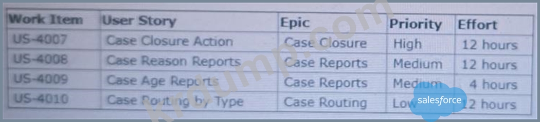 Universal Containers는 고객 서비스 부서를 혁신하기 위해 설계된 Salesforce 솔루션을 구현하고 있습니다. 스프린트 계획 단계에서는 개발팀이 남은 모든 작업 항목을 성공적으로 완료할 수 있을 것으로 예상했습니다. 그러나 예상치 못한 지연으로 인해 개발팀은 이제 작업 항목을 완료하지 못할 위기에 처했습니다.