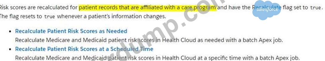 Health Cloud 관리자가 재계산 플래그를 TRUE로 설정하여 위험 재계산을 설정했지만 환자에 대한 재계산 점수가 표시되지 않습니다. 다음 중 환자의 재계산 점수가 표시되지 않는 이유는 무엇입니까?