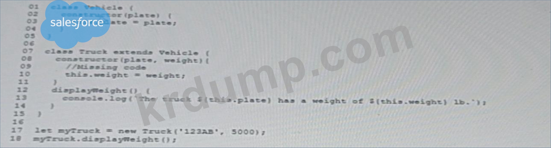 코드를 표시하려면 09번 줄에 어떤 문장을 추가해야 합니까? 트럭 123AB의 무게는 5000파운드입니다.