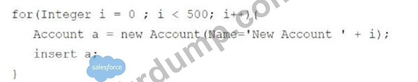 개발자가 Apex 클래스에서 계정에 대한 SOQL 문의 결과 집합을 반복하여 메모리에서 리소스를 많이 사용하는 작업을 수행하는 메서드를 발견했습니다. 또한 이 메서드는 DML 문을 수행하여 변경 사항을 데이터베이스에 저장합니다.