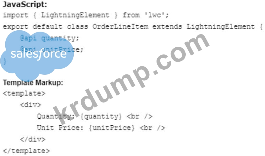 개발자가 주문 라인 항목의 수량, 단가, 총액을 표시하는 Lightning 웹 컴포넌트를 개발하고 있습니다. 총액은 수량에 단가를 곱하여 동적으로 계산됩니다.