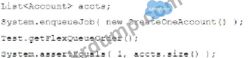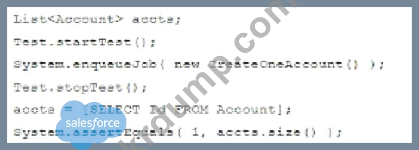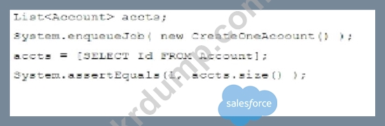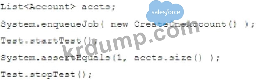 CreateOneAccount 클래스가 하나의 계정을 생성하고 Queueable 인터페이스를 구현한다고 가정할 때, 어떤 구문이 Apex 코드를 적절하게 테스트합니까?