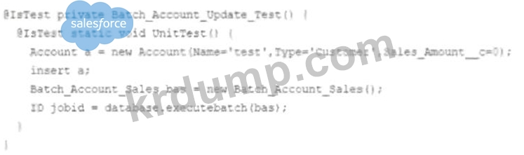 개발자가 Batch_Account_Sales라는 Batch Apex 프로세스를 가지고 있는데, 이 프로세스는 매일 밤 10,000개 계정의 매출 금액을 업데이트합니다. Batch Apex는 샌드박스에서 설계된 대로 작동합니다. 하지만 개발자는 Batch Apex 클래스에 대한 코드 커버리지를 얻을 수 없습니다.