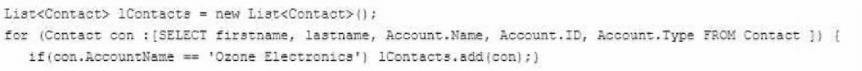 개발자는 계정에서 세 개의 필드(ID, 이름, 유형)를 쿼리하고, 계정과 연결된 모든 연락처의 성과 이름을 쿼리해야 합니다.