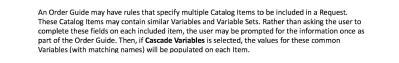주문 가이드에는 여러 항목이 포함될 수 있습니다. 항목에는 배송 위치 및 요청자와 같은 공통 변수가 있습니다. 주문 가이드의 어떤 필드가 true로 설정되었을 때 공통 변수 값을 포함된 각 항목의 해당 변수에 자동으로 복사합니까?