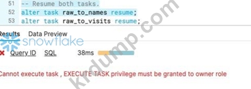 원시 테이블에서 생성된 테이블 스트림을 쿼리하고 행의 하위 집합을 여러 테이블에 삽입하는 TASK를 생성하고 있습니다. 아래 단계를 따르고 있지만 작업을 다시 시작하는 단계에 도달하면 아래와 같은 오류 메시지가 나타납니다.