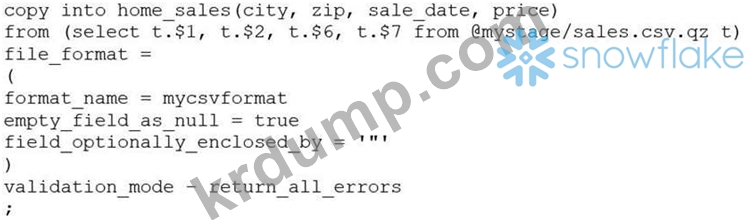 데이터 변환 쿼리를 통해 내부 단계에서 CSV 형식의 데이터를 Snowflake 테이블로 로드하는 다음 COPY 명령을 고려하십시오.